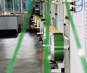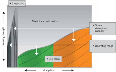 Polyester strapping is characterized by a very consistent tensile strength and very high elongation. Characteristics that are most decisive factor for a safe and reliable strapping method. Unlike strapping made from steel, Polyester strapping having its very high elongation, is able to absorb shocks and impacts during transportation and handling far better than steel strapping is capable of. The excellent elongation allows the substitution for the same application with Polyester strap having a lower breaking strength.