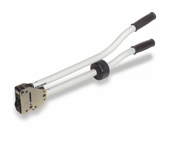 Sealing tool A412 is used in combination with the manual flat or round tensioners A301/A402. The double notch joint is mounted in a single operation, permitting only perfect notch joints thanks to the built-in safety pawl. The ideally curved levers prevent the handle from jamming, guaranteeing rational working with no risk of a hand injury. The rubber spacer on the lower lever also permits sealing with both hands on the upper lever.